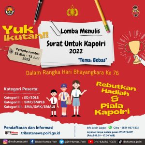 Untuk itu, Divhumas Polri menggelar Lomba yang bertema “Setapak Perubahan Polri 2022” dalam bentuk kreasi pembuatan Vlog, Tiktok, Film pendek, Info Grafis, Foto Grafi dan Blog dengan hadiah ratusan juta dengan periode lomba 11 April hingga 22 Mei 2022.