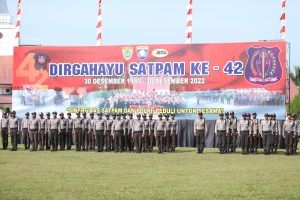 Terkamnews.com|| MEDAN – Upacara HUT SATPAM Ke 42 tahun 2022 bertema Sinergitas Satpam dan Polri, Peduli untuk sesama di laksanakan di Mapolda Sumut, Senin (30/01/2023).