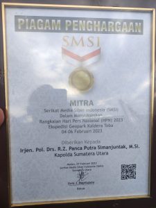 Terlihat di Acara tersebut, Ketua SMSI Provinsi Sumatera Utara terpilih periode Tahun 2022 s/d 2027 Erros J Napitupulu memberikan Piagam penghargaan dalam mensukseskan Rangkaian Hari Pers Nasional (HPN) 2023 Ekspedisi Geopark Kaldera Toba kepada Kapolda Sumut Irjen Pol Drs Panca Putra S, M.Si. yang diwakili Kasubbid Penmas Bidhumas Poldasu AKBP Dr. Herwansyah Putra, S.H.,M.Si.