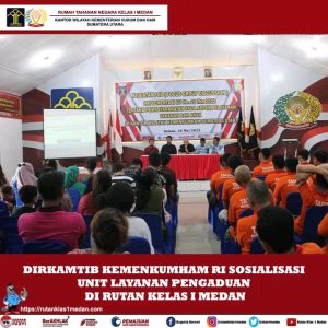 Terkamnews.com||MEDAN – Dalam rangka peningkatan kualitas dan perbaikan pelayanan publik kepada masyarakat, Rutan Kelas I Medan Kanwil Kemenkumham Sumut mengikuti kegiatan Sosisalisasi Unit Layanan Pengaduan (ULP) oleh Direktorat Keamanan dan Ketertiban Kemenkumham RI bertempat di Aula Dr Sahardjo Rutan, Kamis (15/06/2023).