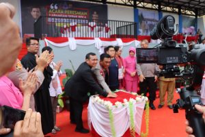 Penandatanganan Prasasti Lapangan Sepakbola Seminarium bersama Kapolda Sumut dan Ephorus HKBP Pendeta Robinson ditandai dengan penekanan tombol secara bersama-sama