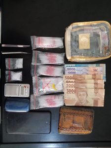 Adapun barang bukti yang berhasil diamankan yaitu : 1 (satu) tempat kosmestik, 2 (dua) buah plastik klips transparan yang diduga sabu berat brutto 6,89 gram, 5 (lima) buah kantong klip transparan kosong, 1 (satu) buah dompet warna coklat, 2 (dua) buah pipet/sekop, 1(satu) buah timbangan elektrik, 1 (satu) buah Handphone merek Vivo, 1 (satu) buah Handphone merek Samsung, Uang sebesar Rp. 90.000 (sembilan puluh ribu rupiah).