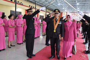 Setelah itu, Kapolresta memberikan bingkisan kepada personil yang purna bakti sekaligus menghantarkan pelepasan 9 Purnawirawan Polri dengan tradisi Pedang Pora.