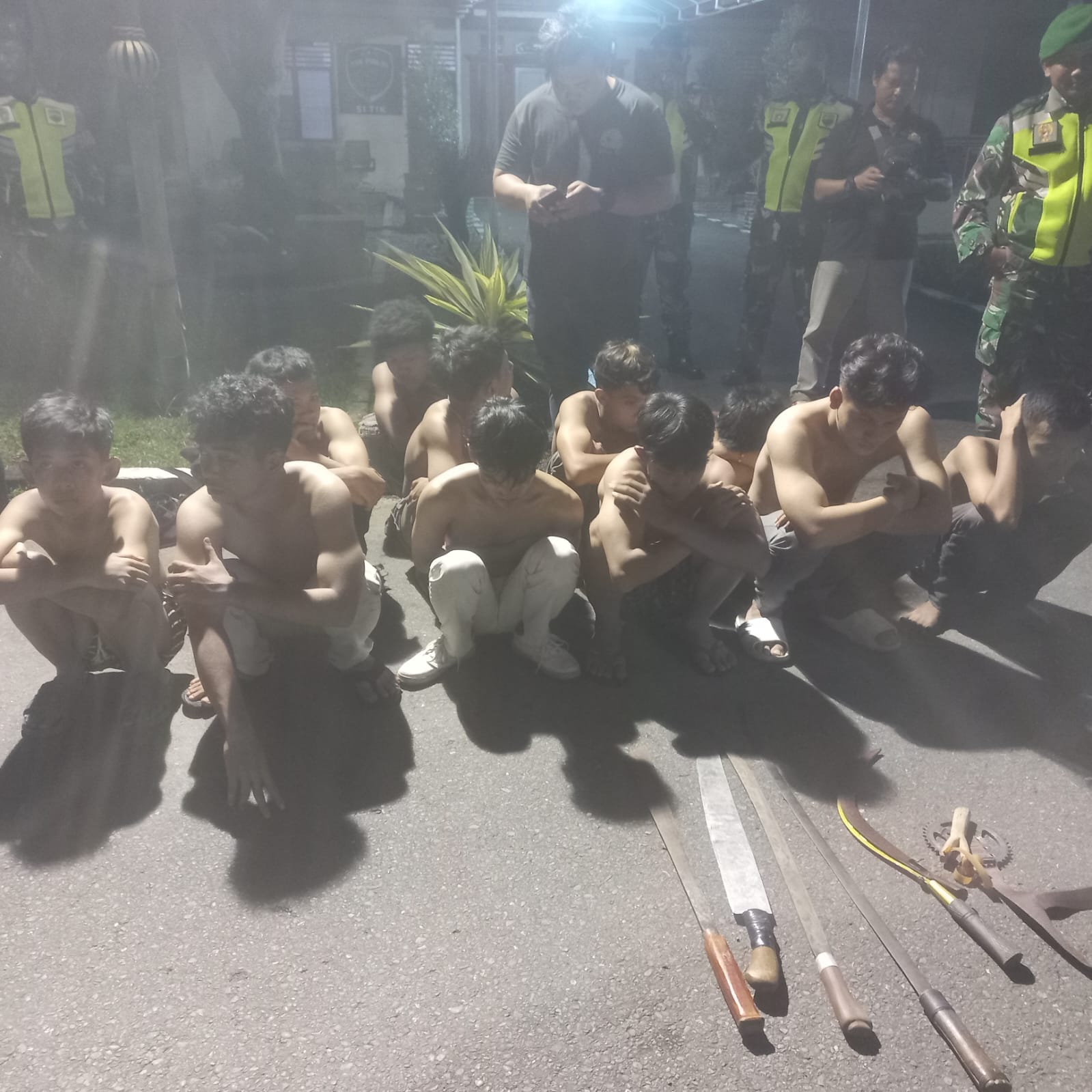 TIM gabungan berhasil mengamankan barang bukti, 6 (enam) unit sepeda motor dengan jenis honda Verza warna abu – abu tanpa No Pol, Honda Vario 125 warna Biru tanpa No Pol, honda Vario 125 warna Hitam dengan No Pol BK 21366 RAZ, Honda Supra 125 X warna Hitam tanpa No Pol, Honda Spacy warna Biru Hitam tanpa No Pol dan Yamaha Jupiter tanpa No Pol, 1 bilah samurai, 3 bilah parang panjang, 1 bilah celurit, 1 buah gear sepeda motor dan 1 buah ketapel.