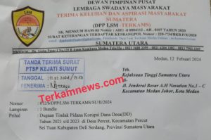 Terkamnews.com || – Deli Serdang Lembaga Swadaya Masyarakat Terima Keluhan Dan Aspirasi Masyarakat Sumatera (LSM-TERKAMS), Resmi Laporkan Desa Percut, Kecamatan Percut Sei Tuan, Kabupaten Deli Serdang Sumatera Utara Ke Kejati Sumut Senin, (12/02/2024) dengan Nomor Surat : 012/b/DPP LSM- TERKAMS/SU/II/2024 diterima di PTSP.