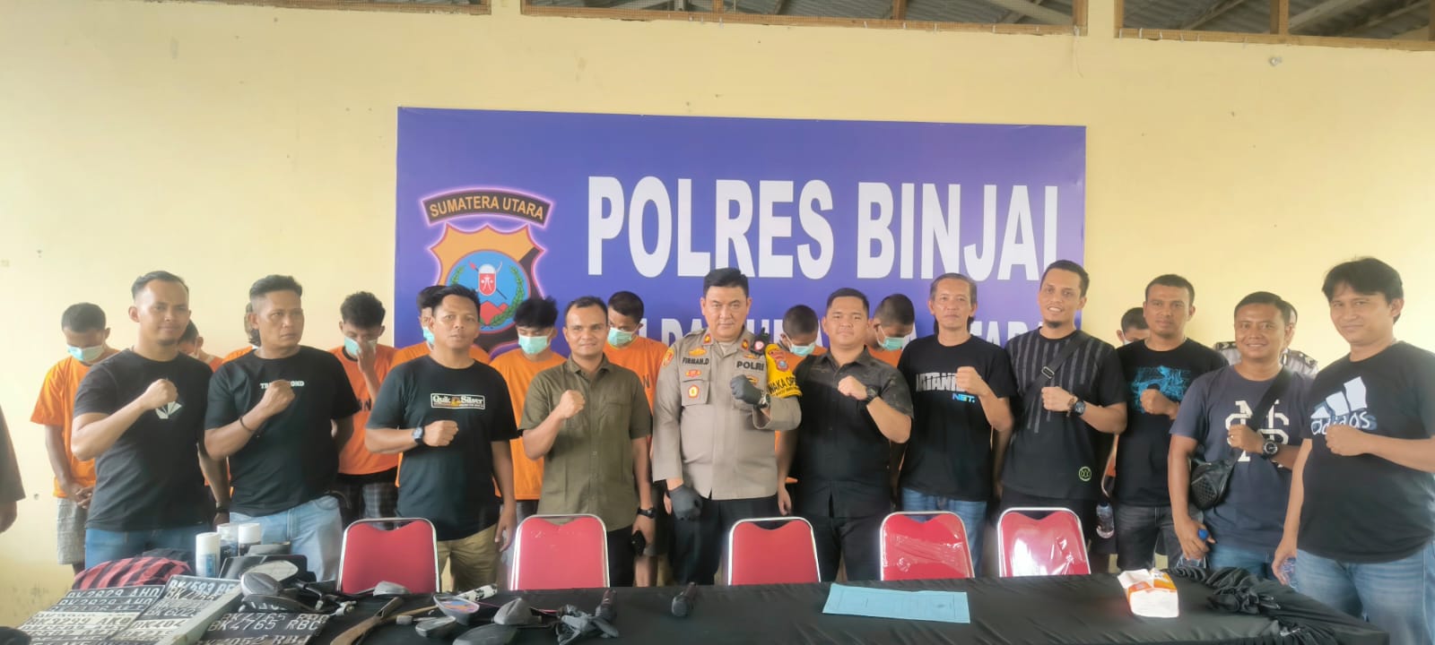 “Adapun tersangka yang dihadirkan, ada 13 orang terduga pelaku dan dua diantaranya masi berstatus pelajar. Untuk pasal yang diterapkan masih sama,” ucap Kompol Firman didampingi Kasat Reskrim Polres Binjai AKP Zulhatta Mahadi dan Kanit Pidum Ipda Benjamin Silaban.