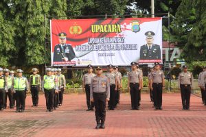 Wakapolres Kompol Henman Limbong, S.P., S.I.K, bertindak sebagai inspektur upacara dan IPDA Nico cs. Perangin-angin sebagai komandan upacara.