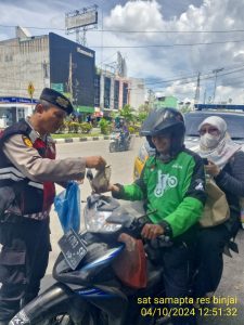Terkamnews.com||BINJAI – Selesai melaksanakan ibadah sholat di hari Jumat, Personil Sat Samapta Polres Binjai melaksanakan kegiatan Jumat barokah dengan membagikan nasi bungkus terhadap petugas parkir, pengemudi Betor dan pengemudi angkutan umum, di Jalan Jenderal Sudirman, kota Binjai, Provinsi Sumatera Utara.