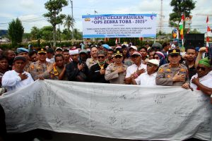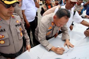 Dalam rangka menunjukkan komitmen bersama, peserta aksi bersama jajaran Polres Pelabuhan Belawan turut melakukan penandatanganan kain putih sebagai simbol dukungan masyarakat terhadap langkah tegas kepolisian dalam memberantas begal dan aksi tawuran di wilayah Belawan.