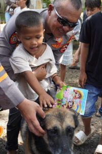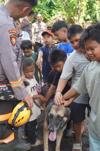Anak-anak tampak antusias dan gembira saat berinteraksi langsung dengan anjing pelacak K-9 yang memiliki spesifikasi SAR. Kehadiran satwa K-9 ini tidak hanya menjadi sarana hiburan, tetapi juga media terapi psikologis yang efektif untuk membantu mengurangi trauma, rasa takut, serta tekanan emosional yang dialami anak-anak pascabencana.