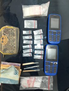 3 buah pipet sekop, 1 buah dompet, 1 buah plastik sedang kosong, 1 buah plastik kecil kosong dan 2 unit handphone merek Nokia warna biru