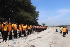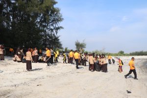 Selesai apel di lanjutkan dengan pembersihan pesisir pantai objek wisata Pantai Sentang dari sampah organik maupun non organik seperti sampah bekas kantongan pelastik, sisa sisa tempat/wadah makanan, sampah bekas jaring nelayan yang hanyut dan terbawa ombak ke pantai, kayu ranting pohon maupun dedaunan, di kumpulkan di tumpuk di beberapa tempat dan sebagain di bakar.